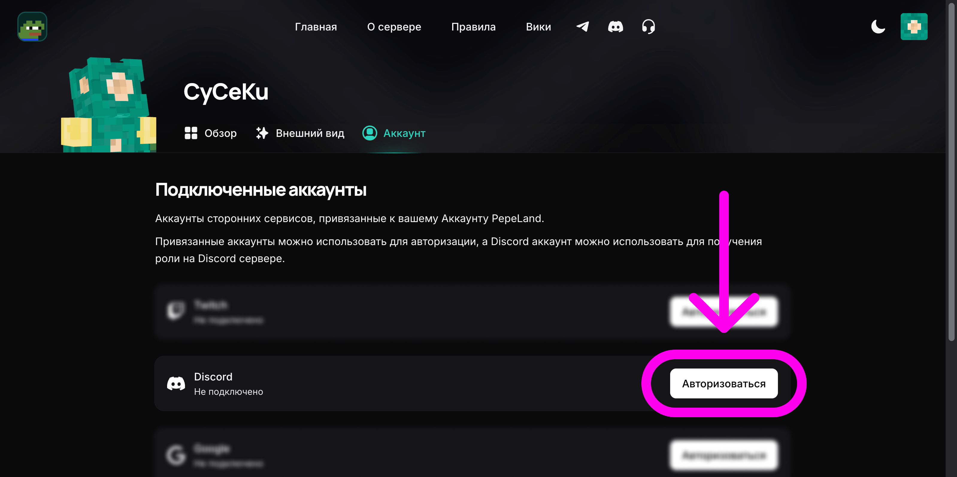 Нажмите сюда и нажмите в разделе Discord кнопку «Подключить»