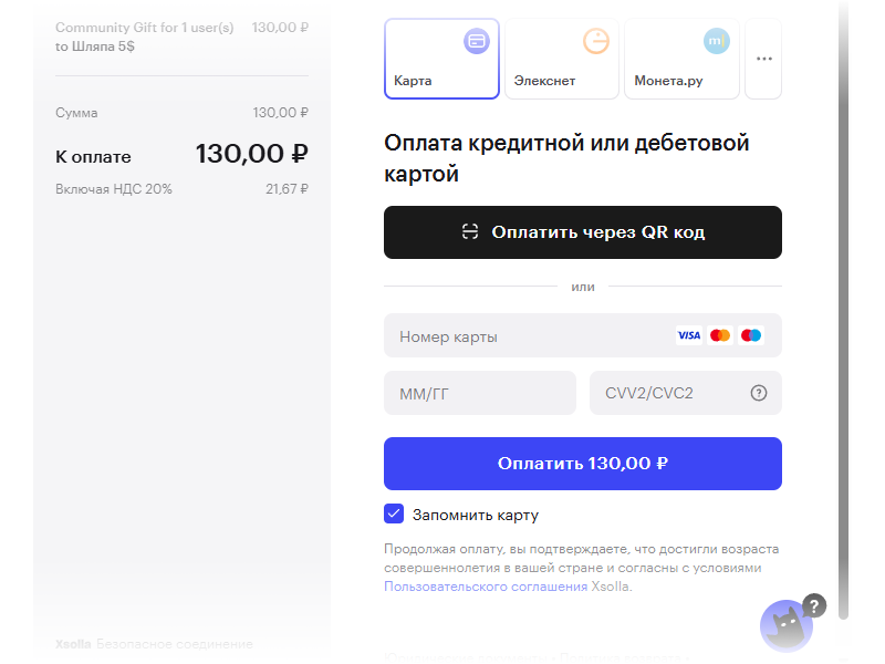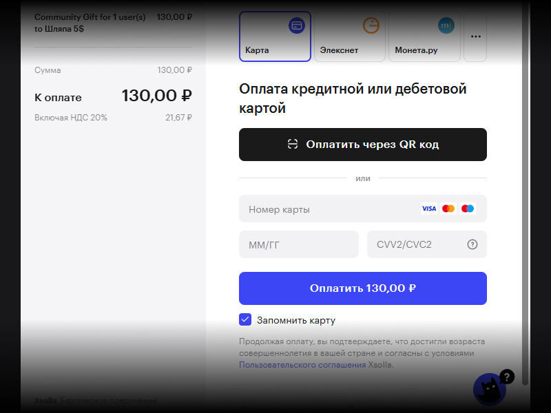 Поддерживаются карты Visa, Mastercard, МИР несанкционных российских банков.